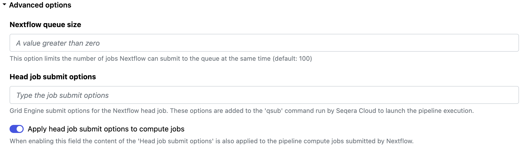 • Use the Head job submit options to specify platform-specific submit options for the head job. You can optionally apply these options to compute jobs as well: